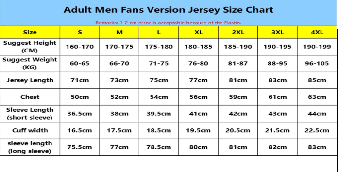 Please note that due to measurement errors, there may be a 1-2 inch discrepancy between the actual jersey size and the size chart,